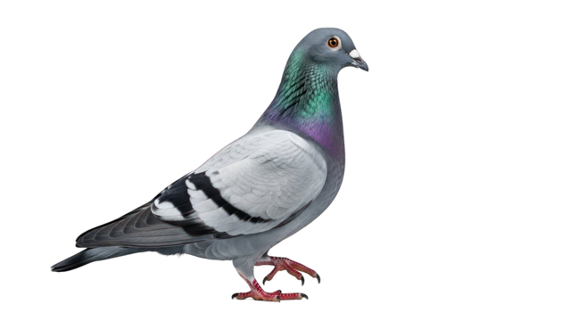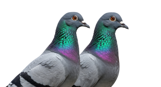 two common rock pigeons standing side-by-side, displaying dusty grey plumage and vibrant metallic neck iridescence against a transparent studio background, celebrating educational urban wildlife