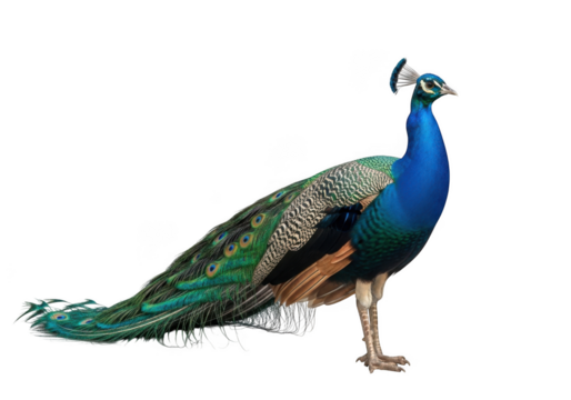 Pigeon standing on one foot with vibrant iridescent feathers on its neck against a plain white background