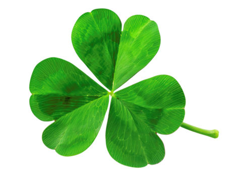 Close-up image of a vibrant green four-leaf clover, symbolizing luck and good fortune, isolated on white background.
