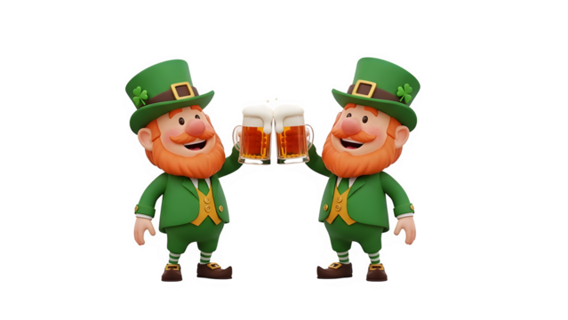Two cheerful leprechauns isolated on transparent background with beer