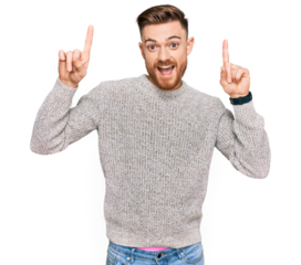 Young redhead man wearing casual winter sweater smiling amazed and surprised and pointing up with fingers and raised arms.