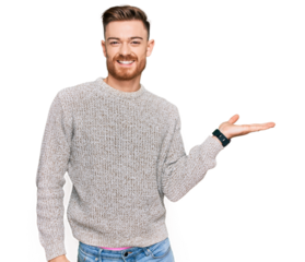 Young redhead man wearing casual winter sweater smiling cheerful presenting and pointing with palm of hand looking at the camera.