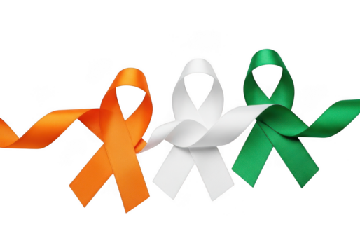 Three awareness ribbons in orange, white, and green colors representing the irish flag, isolated on transparent background