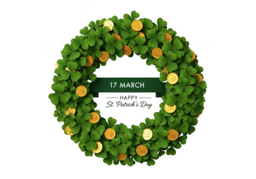 St patricks day wreath made of shamrock clover leaves and gold coin decoration with text message isolated on transparent background
