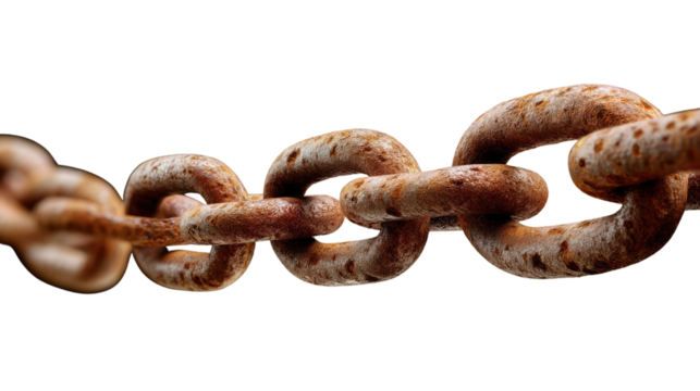 Connected Links: A weathered, rusty metal chain links together, showcasing strength and interconnectedness. Close-up shot revealing the texture and corrosion of the industrial structure.