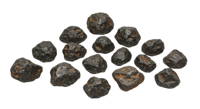 Group of Raw Iron Ore Lumps Isolated on a Transparent PNG Background , iron ore, ore, iron, mineral, rock, stone, lumps, raw, natural, geological, geology