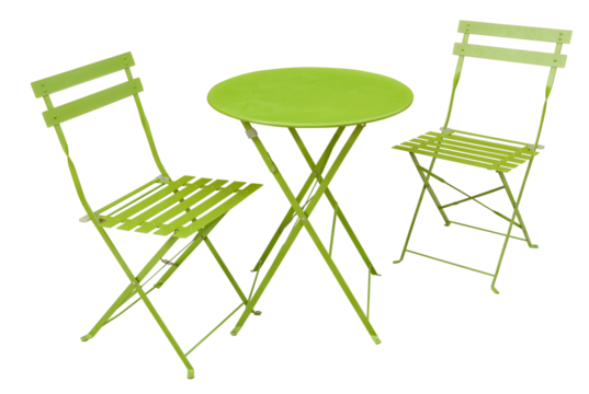 Classic round wooden table with metal legs and chairs, isolated on transparent cutout background