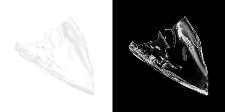 Shattered irregular pieces of broken clear glass isolated on transparent background