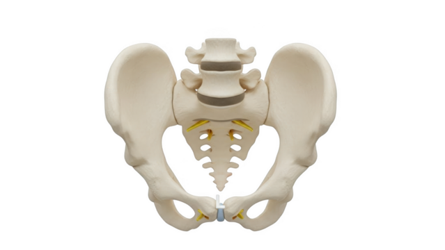 Detailed anatomical illustration of the human pelvis, showcasing bone structure and hip joints.