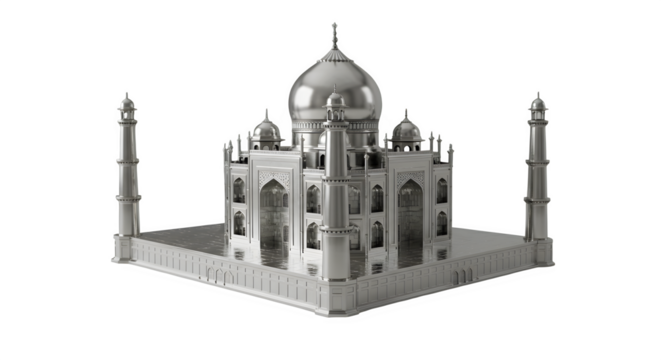 Silver taj mahal model showcasing intricate architecture and historical significance on transparent background