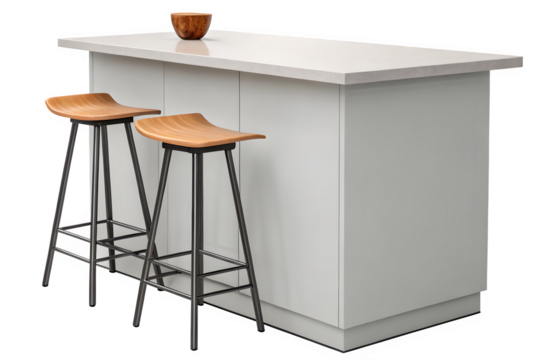 Modern kitchen island featuring stylish wooden stools and a bowl ready for creative interior design