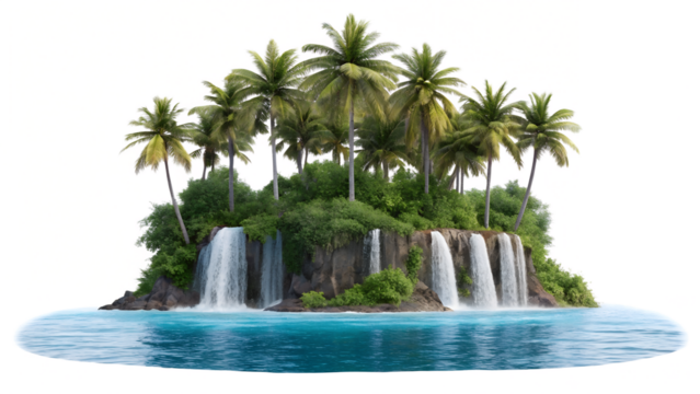 Tropical island with palm trees and cascading waterfalls isolated on transparent background