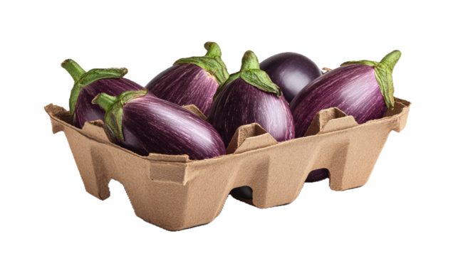 Confezione in cartone contenente melanzane viola, che trasmette un messaggio di eco-compatibilità e cura per il dettaglio, valorizzando i prodotti naturali. Sfondo trasparente