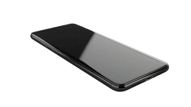 Sleek modern smartphone with a black screen, angled view, isolated on white background.