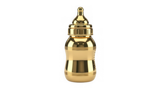 A shiny golden baby bottle isolated on a transparent background, symbolizing luxury and wealth