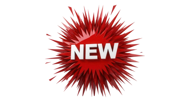 Red burst with the word NEW isolated PNG on transparent background, promotional graphic for sales and announcements