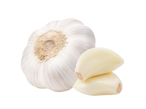 A whole fresh garlic head and clove segment isolated against a transparent background.