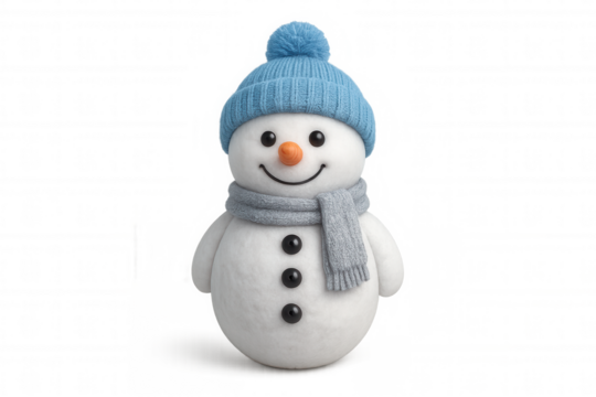 Snowman character wearing blue beanie and gray scarf, celebrating winter and holiday season, isolated on transparent background