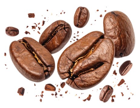 Collection of roasted coffee beans with a wooden bowl of grounds against a transparent, black background