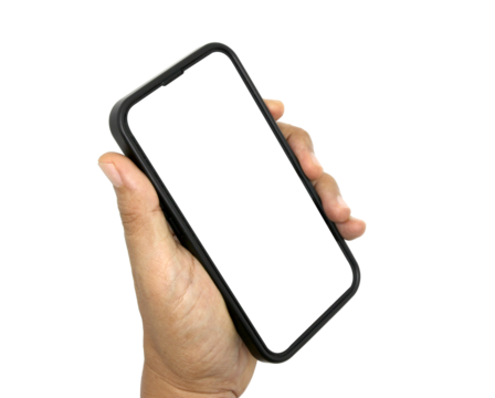 A hand holding a cell phone with a blank screen. Isolated on transparent background, PNG