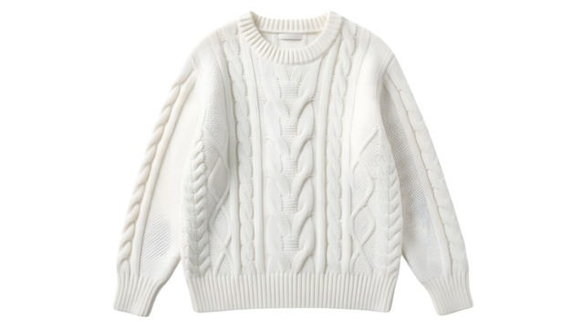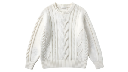 White cable knit sweater with long sleeves and crew neck isolated on transparent background