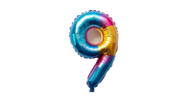 Metallic silver mylar numeral nine balloon hovering against clean white background, creating celebratory visual impact