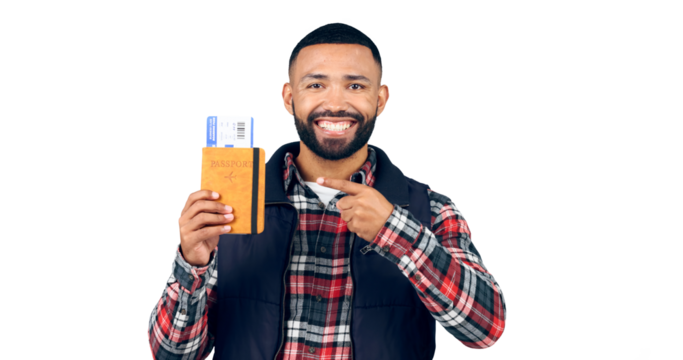 Pointing, smile and portrait of man with passport for travel, vacation or holiday with document. Face, happy and young male tourist with ticket for weekend trip isolated by transparent png background