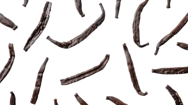 Falling roasted coffee beans in mid air showing realistic brown texture isolated on a transparent background