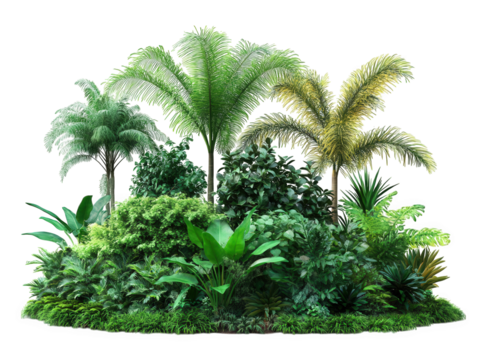 set of tropical evergreen rainforest, with tree,plants, shrub,bush and grass, isolated on transparent background . PNG, cutout, or clipping path.