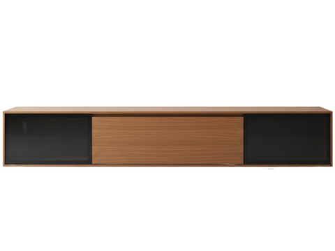 Modern wooden tv stand with sleek black glass doors and wooden drawer front, perfect for living room decor, isolated on transparent background