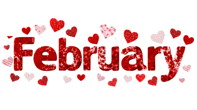 Decorative typography "February" with subtle heart dot on the letter i style, isolated on a white background