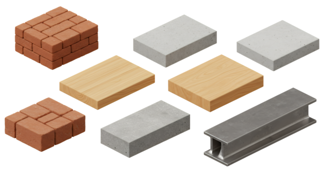 Construction Materials Isometric View Bricks Concrete Wood and Metal
