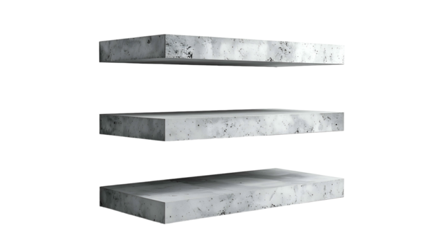 Three stacked rectangular concrete platforms suspended in black space, floating