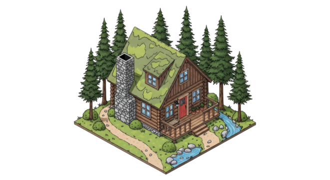 secluded forest cabin isometric illustration of a rustic log home, tranquil creekside escape, isolated on transparent background