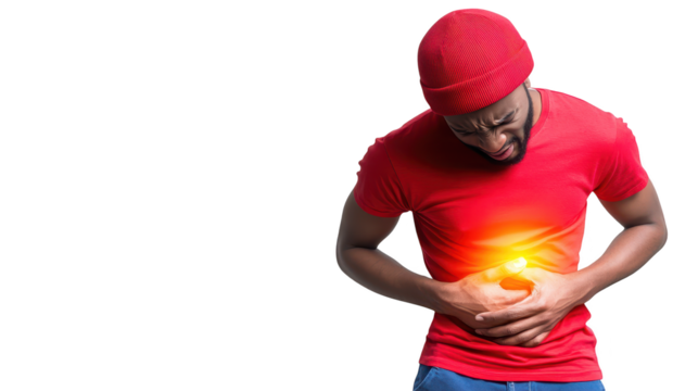 Man in red shirt holding stomach, a visual depiction of discomfort and potential health issues