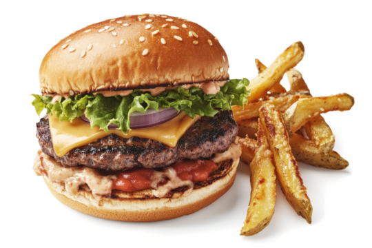 a hamburger with a cheese and lete on it cutout image and isolated on transparent background
