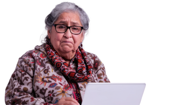 Mexican senior female Employee IT specialist sit at work with laptop on white background