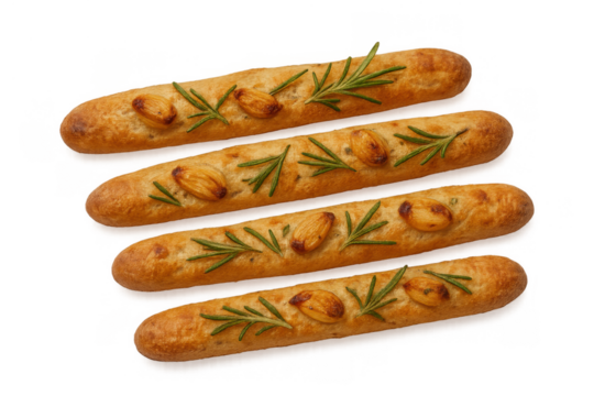 Four golden brown breadsticks baked with roasted garlic cloves and fresh rosemary sprigs, perfect for food themes