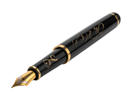 Elegant fountain pen with gold trim and nib, against a black background