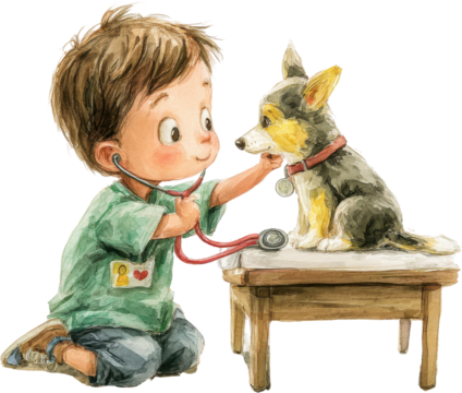 Child veterinarian boy puppy stethoscope checkup cartoon illustration watercolor cute caring