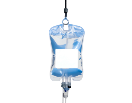 Isolated IV fluid bags, blue liquid for medical treatment, hydration solution, hospital equipment