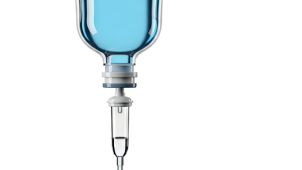 Medical iv drip bag hanging with blue liquid inside, connected to a transparent tube and a needle, on a transparent background, ready for intravenous therapy