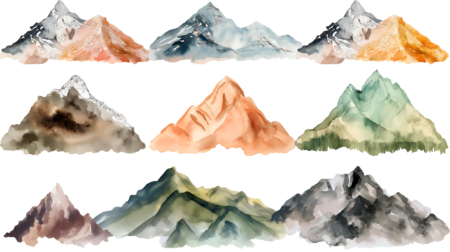 Collection of nine distinct watercolor painted mountain range illustrations featuring varied earthy and cool color palettes perfect for nature designs