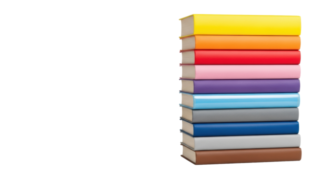 Perfectly vertical stack of nine new books, vibrant spines (yellow, orange, red, pink, purple, light blue, dark blue, gray, brown) on transparent background with copy space, concept of structured