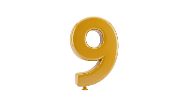 3D Gold balloon number 9 on transparent background