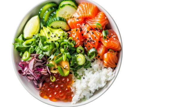 Vibrant Bowl of Fresh Poke with Avocado, Cucumber, and Tuna Garnished with Sesame Seeds