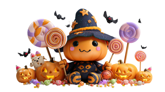 Cute pumpkin witch holding colorful lollipops surrounded by jack o lanterns and candies isolated on white background