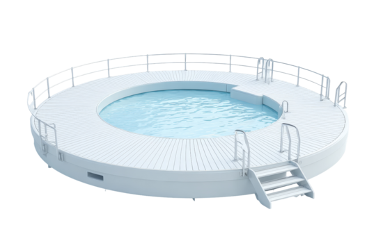 Circular above ground swimming pool with deck and ladder isolated.