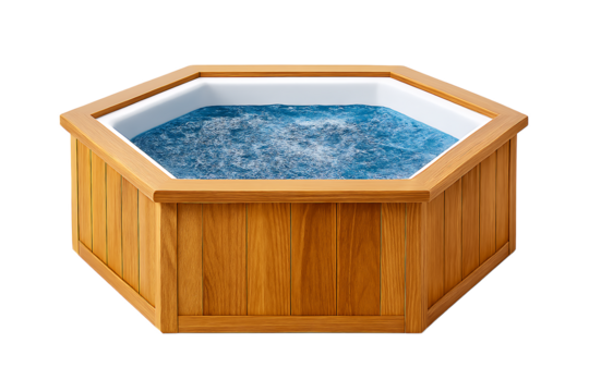Hexagonal Wooden Hot Tub Filled with Bubbling Blue Water on White Background jacuzzi isolated on a transparent background