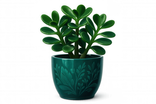 Lush jade plant with vibrant green leaves thrives in a decorative teal pot, set against a transparent background